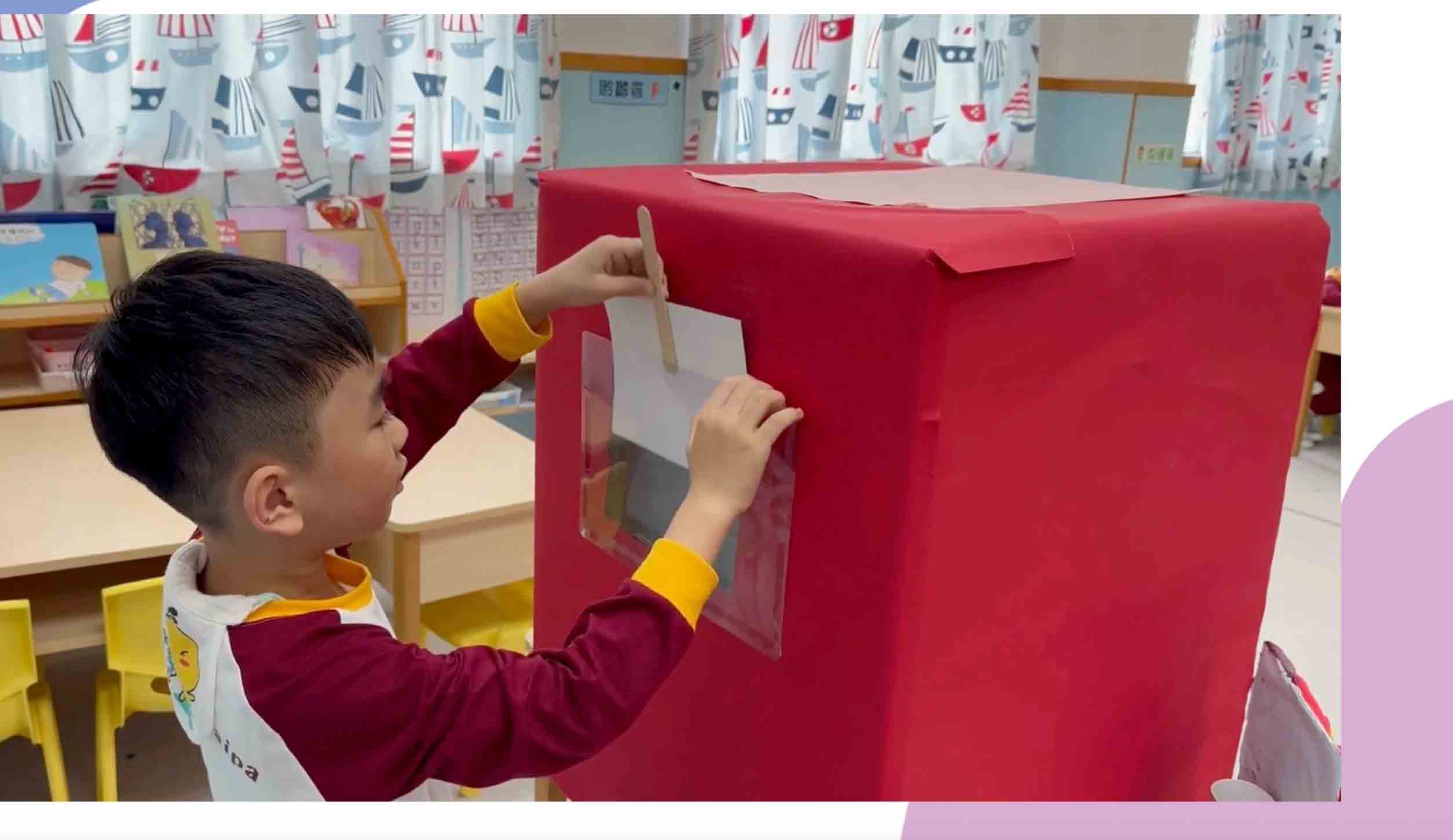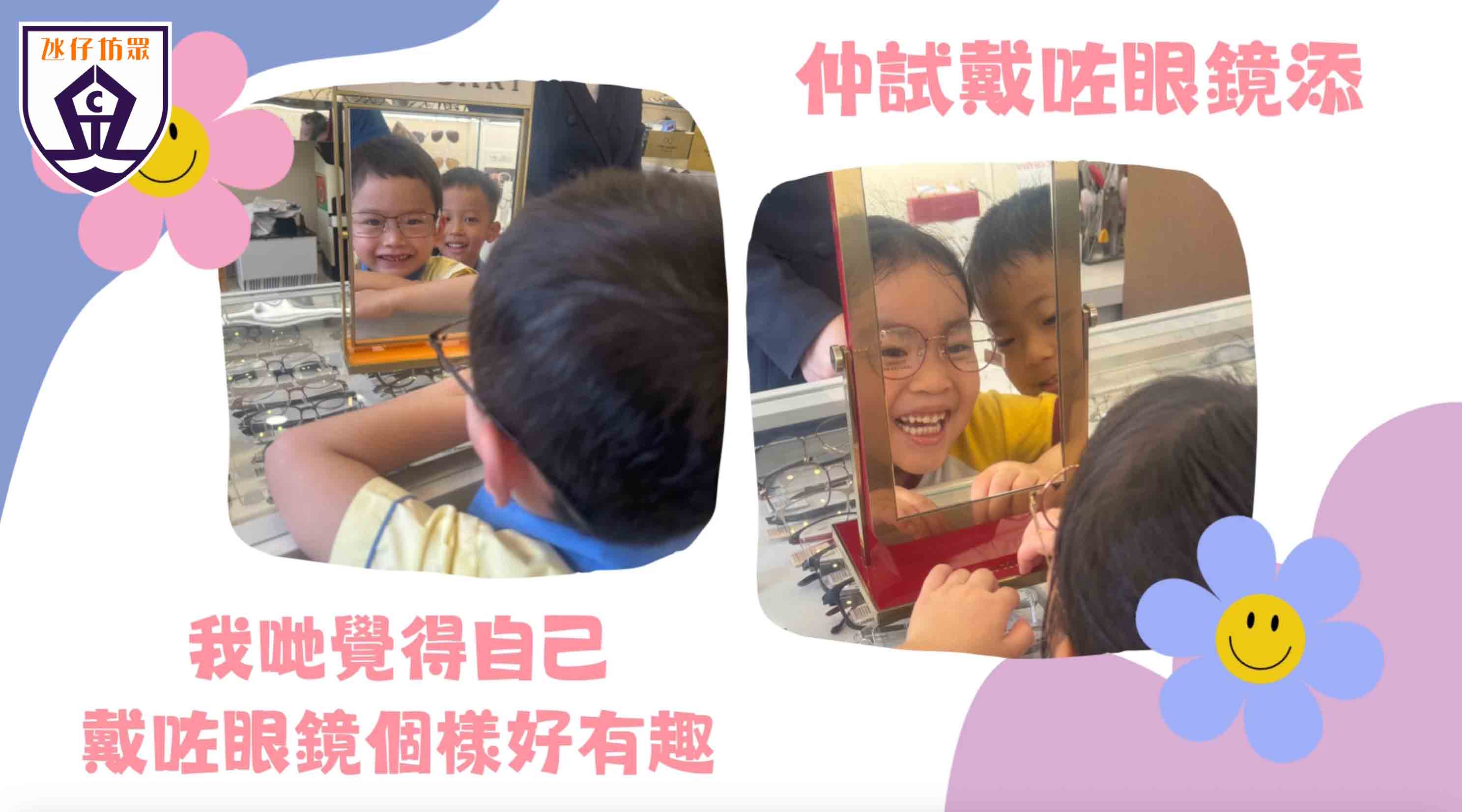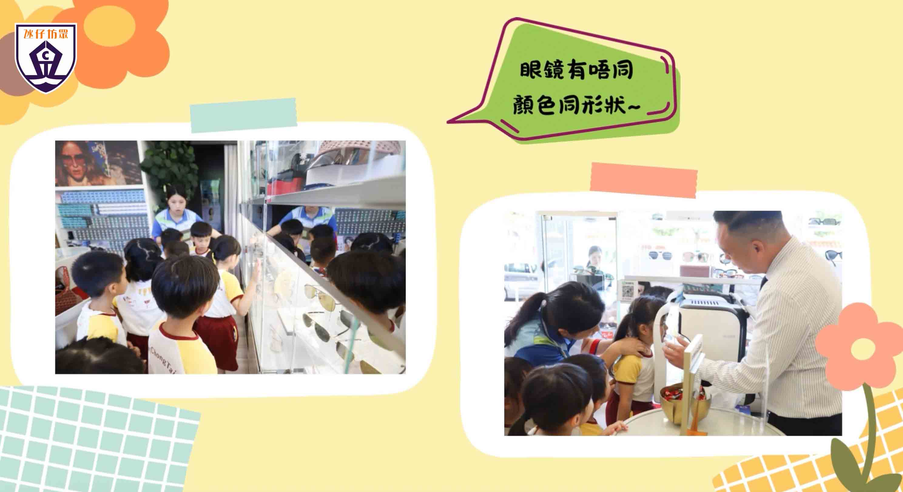 K3級幼兒從探索眼鏡店出發,將所見所感帶回課室後,分工合作打造屬於自己班本的眼鏡店。孩子們親自繪製草圖、挑選材料,製作出專屬的眼鏡、視力表與驗眼儀,更開設了一間「小小眼鏡舖」,主動接待客人、介紹作品。這段從探索到創造的旅程,滿載著幼兒的專注與成就感。