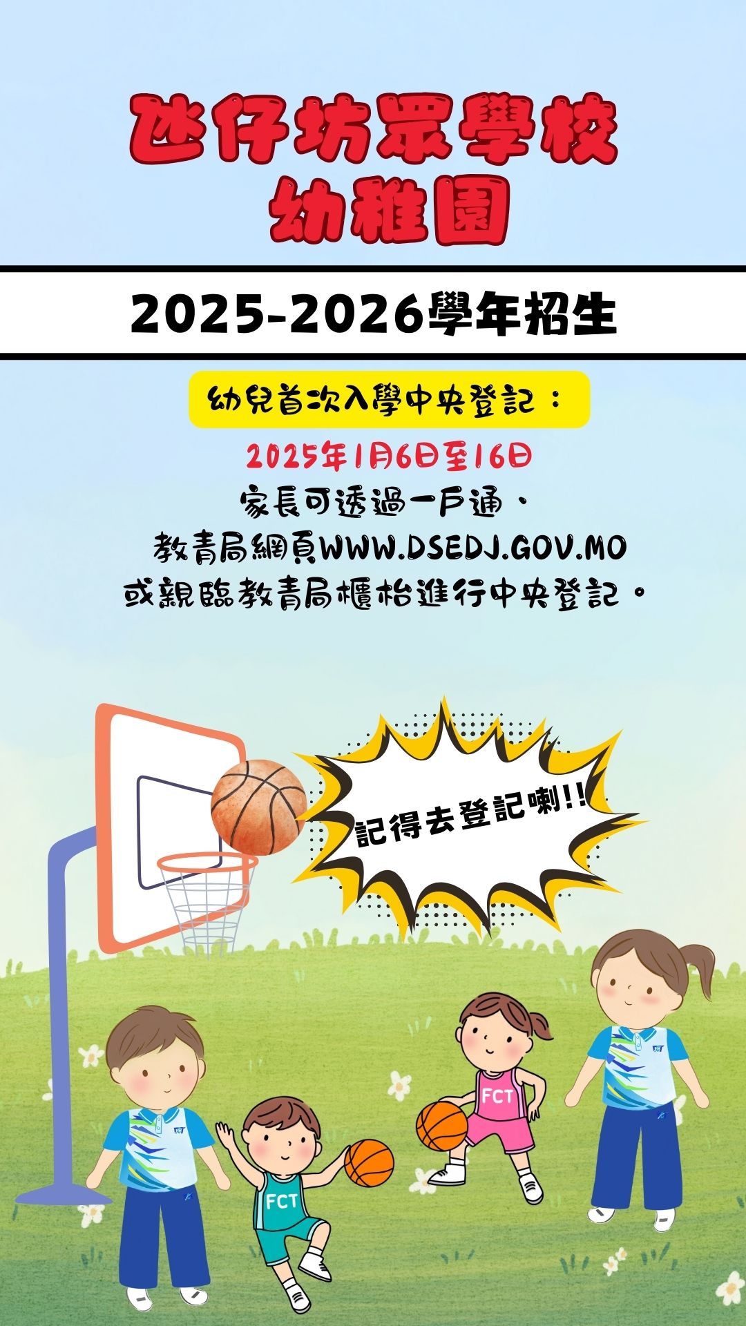 氹仔坊眾學校幼稚園幼兒入學首次登記開始啦!